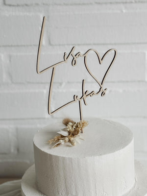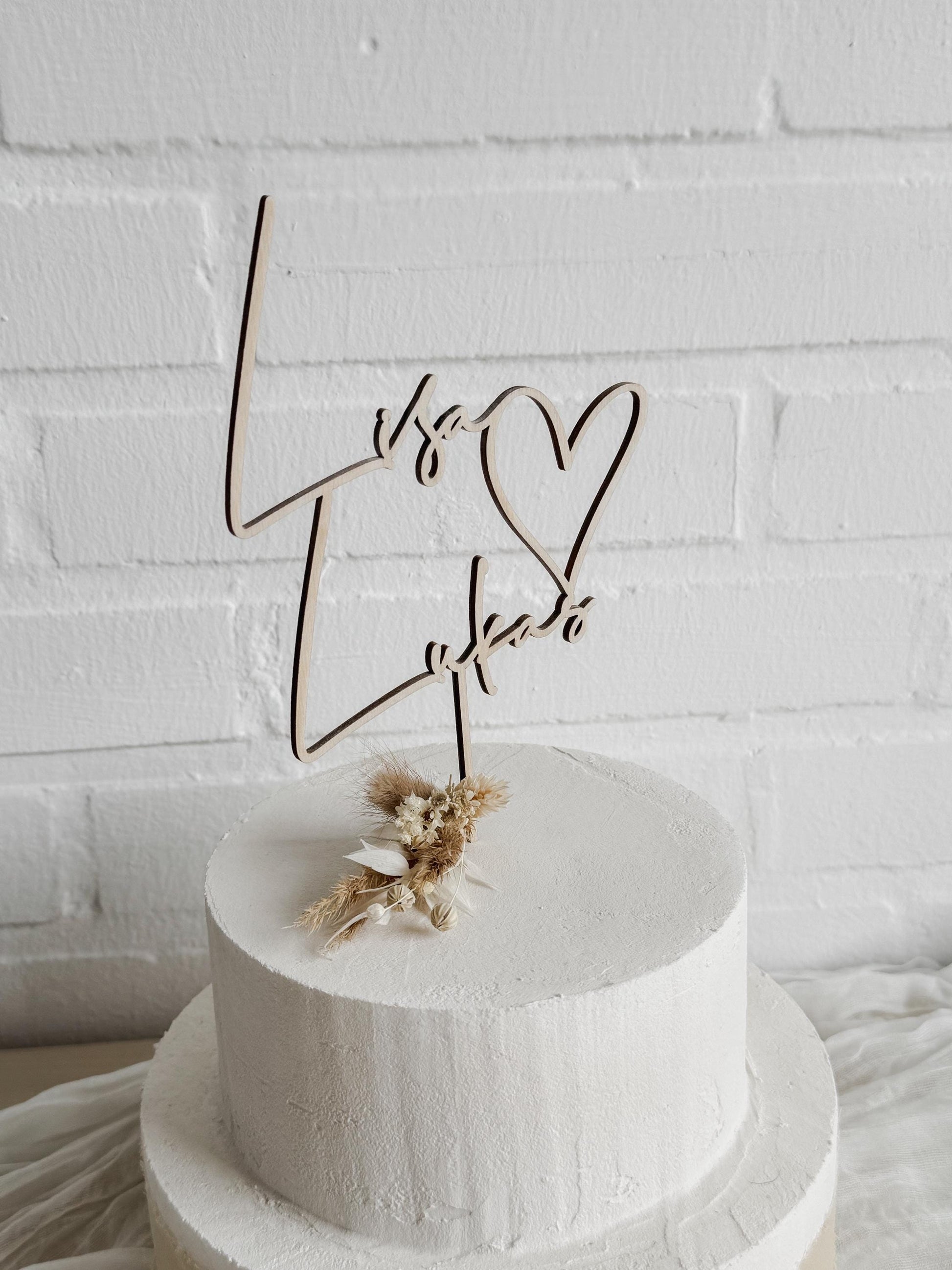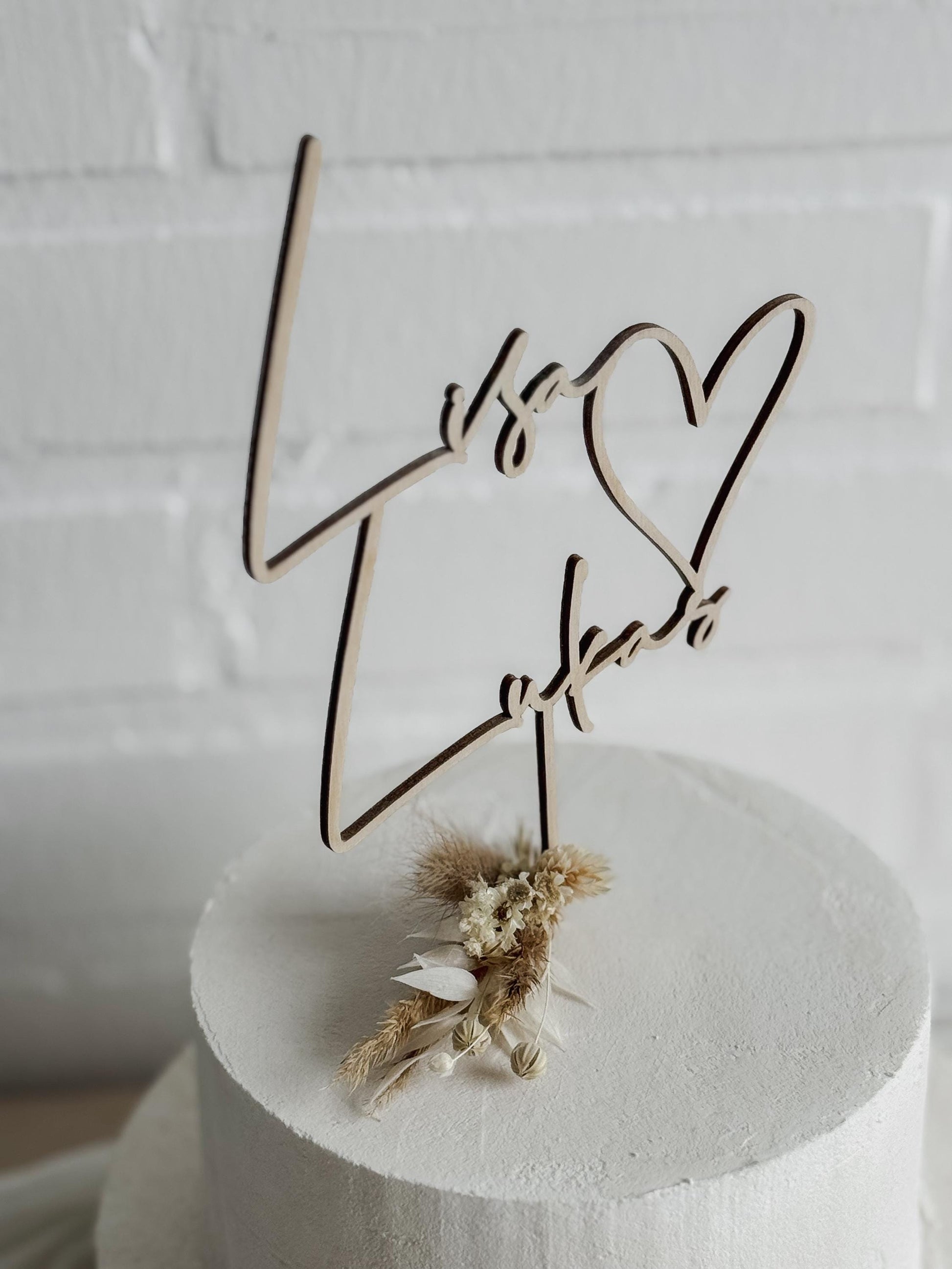 Verleiht eurer Hochzeitstorte mit diesem wunderschönen Caketopper den letzten Schliff. In schwungvoll gestaltetem Handlettering, personalisiert mit euren Wunschnamen, ist der Caketopper auf Eurer Torte ein wahrer Eyecatcher. Die Vornamen sind durch ein Herz verbunden.