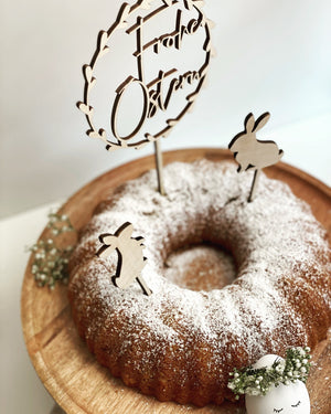 Dieser schöne Caketopper mit dem Schriftzug 'Frohe Ostern' verleiht eurem Kuchen oder eurer Torte das besondere Etwas.