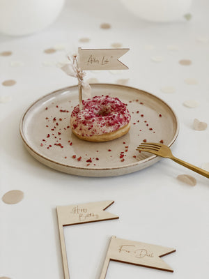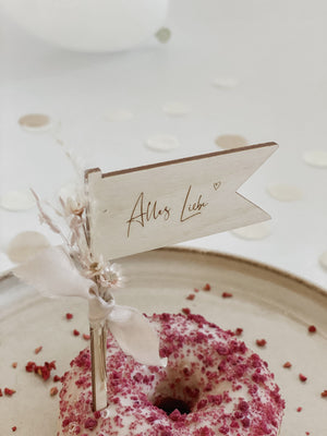 Produktdetails: ♦ Birkensperrholz 4mm Stärke ♦ Maße: kleine Fahne: 3 x 6,5cm (perfekte Größe für Muffin oder Donut) große Fahne : 3,5 x 8cm (perfekte Größe für einen Minikuchen) ♦ Länge des Stieles: 8,5cm