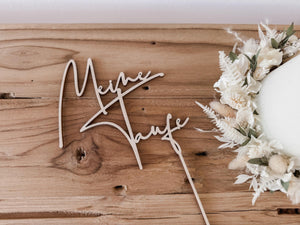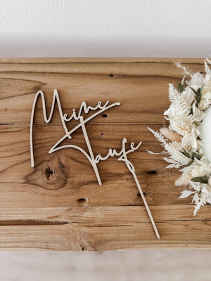 Dieser elegante Caketopper aus Holz mit dem Schriftzug ‚Meine Taufe‘ ist das I-Tüpfelchen auf jeder Tauftorte. Mit seiner natürlichen Optik und feinen Verarbeitung wird er zum besonderen Highlight auf dem Kuchenbuffet.
