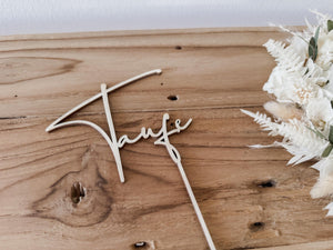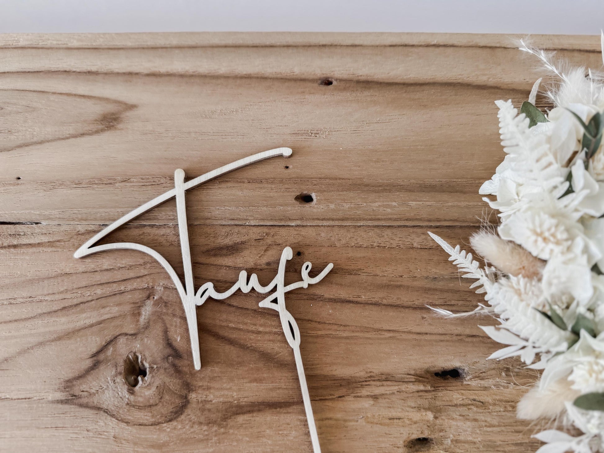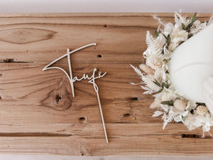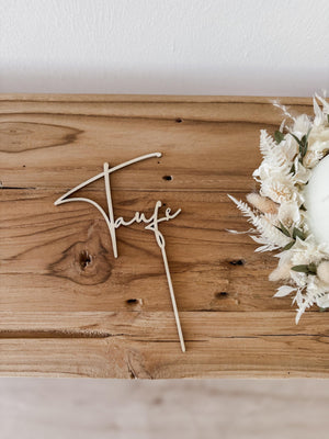 Dieser elegante Caketopper aus Holz mit dem Schriftzug ‚Taufe‘ ist das I-Tüpfelchen auf jeder Tauftorte. Mit seiner natürlichen Optik und feinen Verarbeitung wird er zum besonderen Highlight auf dem Kuchenbuffet.
