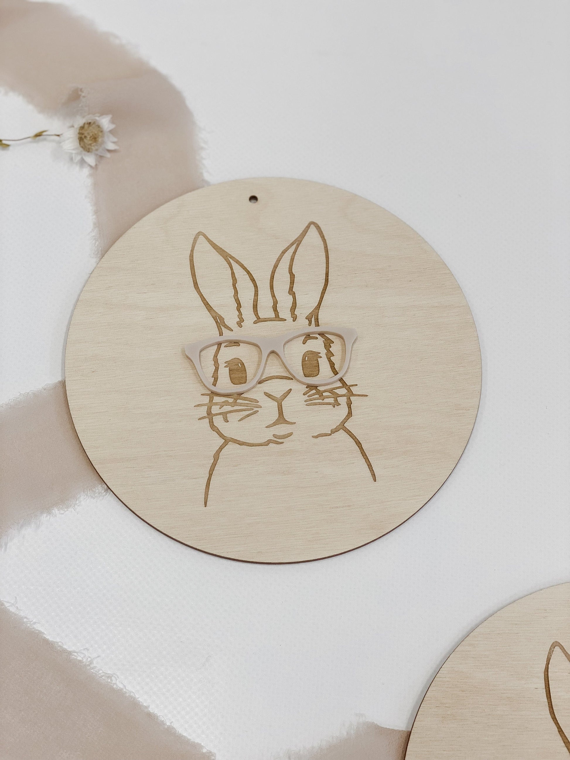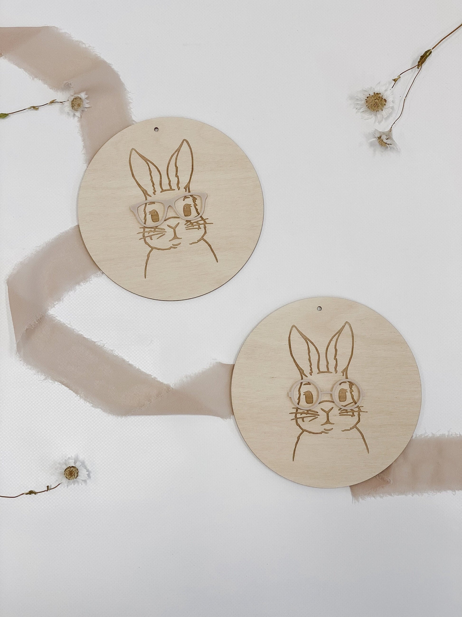 Dieses schöne Holzschild mit Hasenmotiv und farbiger Brille ist ein toller Blickfang in eurer Osterdekoration. Ob als Austauschscheibe in eurem Trockenblumenkranz oder als Wanddekoration wird dieser supersüße Hase zu einem echten Hingucker.