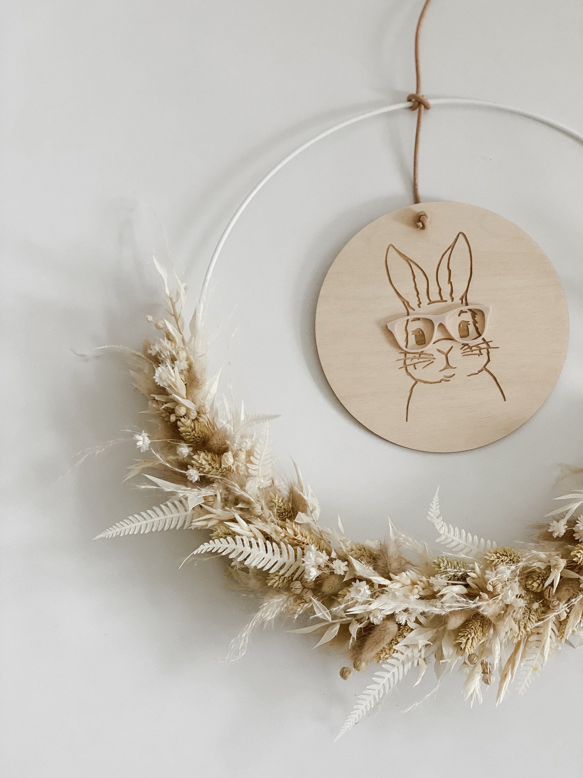 Materials: Holzschild Osterhase,Holzschild Trockenblumenkranz,Hase mit Brille,Frohe Ostern,Austauschscheibe Trockenblumenkranz,Osterdekoration,Geschenkidee Ostern,Holzschild für eine Türkranz
