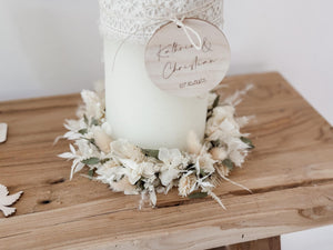 Dieser liebevoll von Hand gefertigte Kerzenkranz aus hochwertigen Trockenblumen ist ein wunderschönes Accessoire für unvergessliche Anlässe wie Taufen, Kommunionen, Konfirmationen, Hochzeiten oder andere besondere Feiern. Mit seiner natürlichen Eleganz verleiht er jeder Tischdekoration einen stilvollen und harmonischen Akzent. Der Kranz ist farblich abgestimmt in sanften, natürlichen Tönen (Creme, Eukalyptusgrün) und passt perfekt um Taufkerzen, Kommunionkerzen oder Hochzeitskerzen mit einem Durchmesser von 10cm.