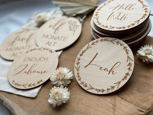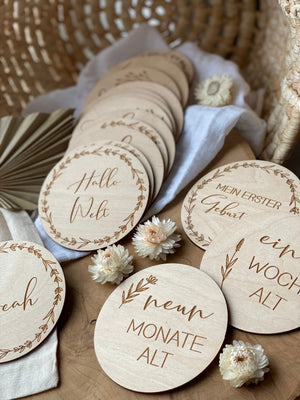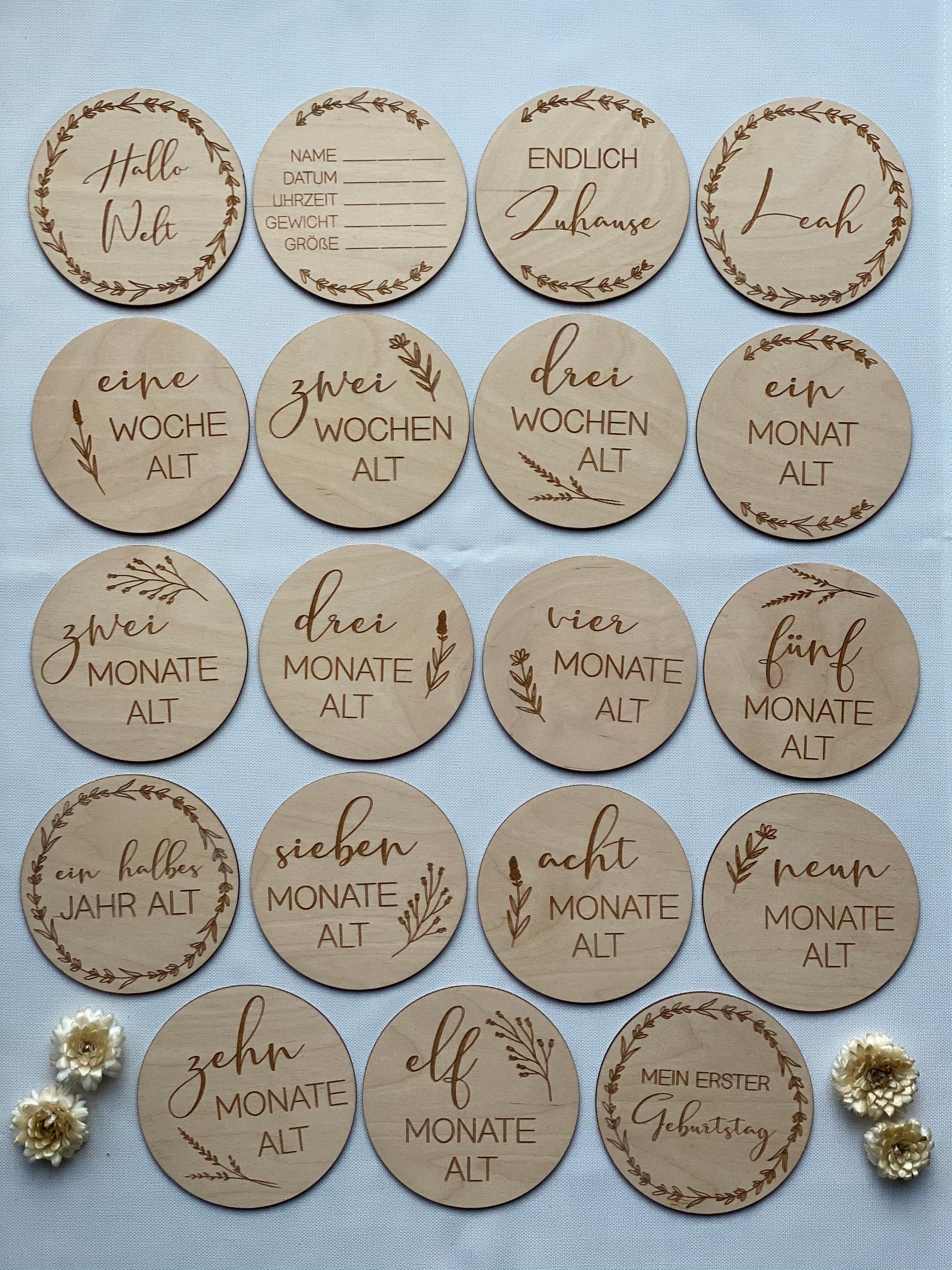 Diese wunderschönen Meilensteinkarten sind eine tolle Möglichkeit die verschiedenen Etappen der Entwicklung eures Babys festzuhalten und machen eure Babyfotos einmalig und unvergesslich. Das perfekte Geburtsgeschenk für alle Mamas, die Wert auf schöne Erinnerungen legen! Das Set ohne Personalisierung beinhaltet 9 doppelseitig gravierte Holzschilder (mit Personalisierung 10 gravierte Holzschilder) mit einem Durchmesser von 10cm: