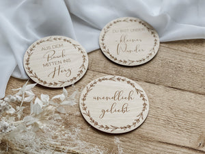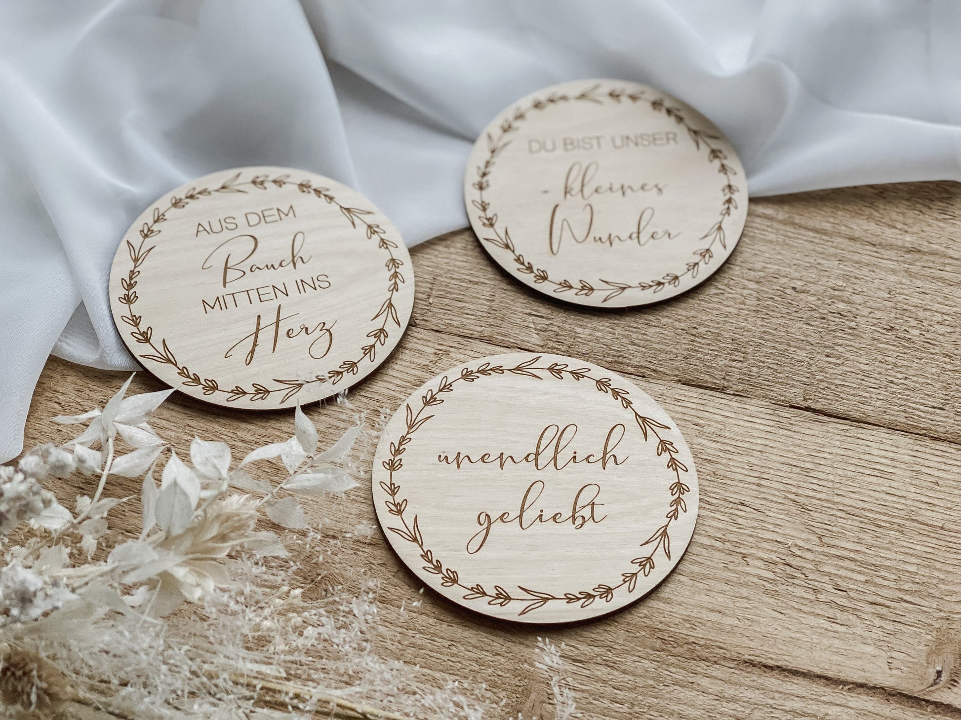 Die Schilder bestehen aus 3mm starkem Sperrholz, sind im Durchmesser 15 oder 20cm breit und haben eine Aufhänge-Schlaufe aus Lederband.