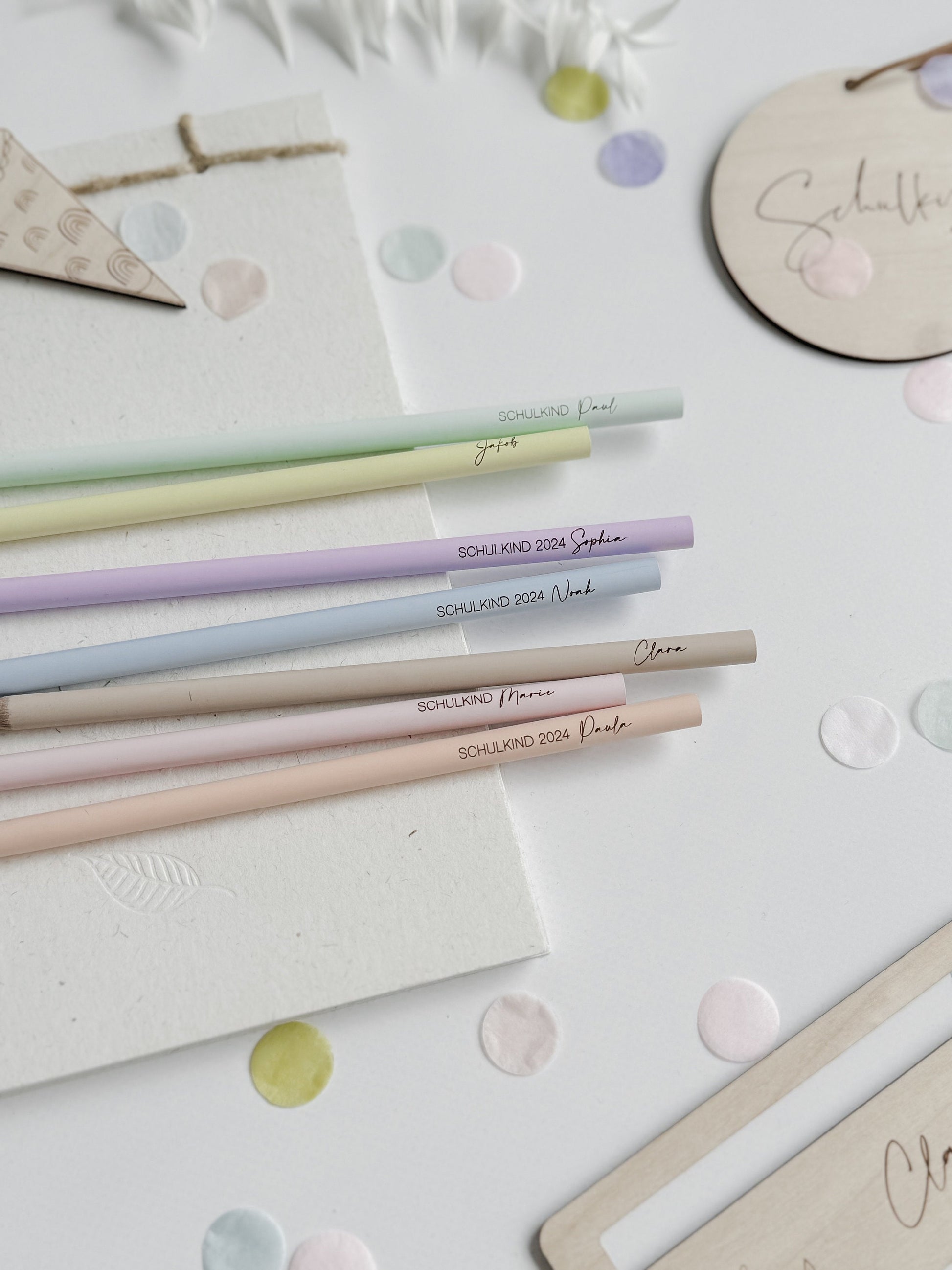 Unsere Bleistifte sind nicht nur ein tolles Geschenk für die Schultüte, auch die älteren Schüler und Schülerinnen haben sicher doppelt viel Freude beim Schreiben und Zeichnen mit den schönen pastellfarbigen Stiften personalisiert mit eigenem Namen.
