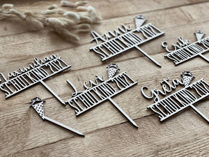 Der Caketopper besteht aus 3mm starkem Sperrholz und ist im Durchmesser ca. 15cm oder 20cm breit.
