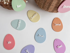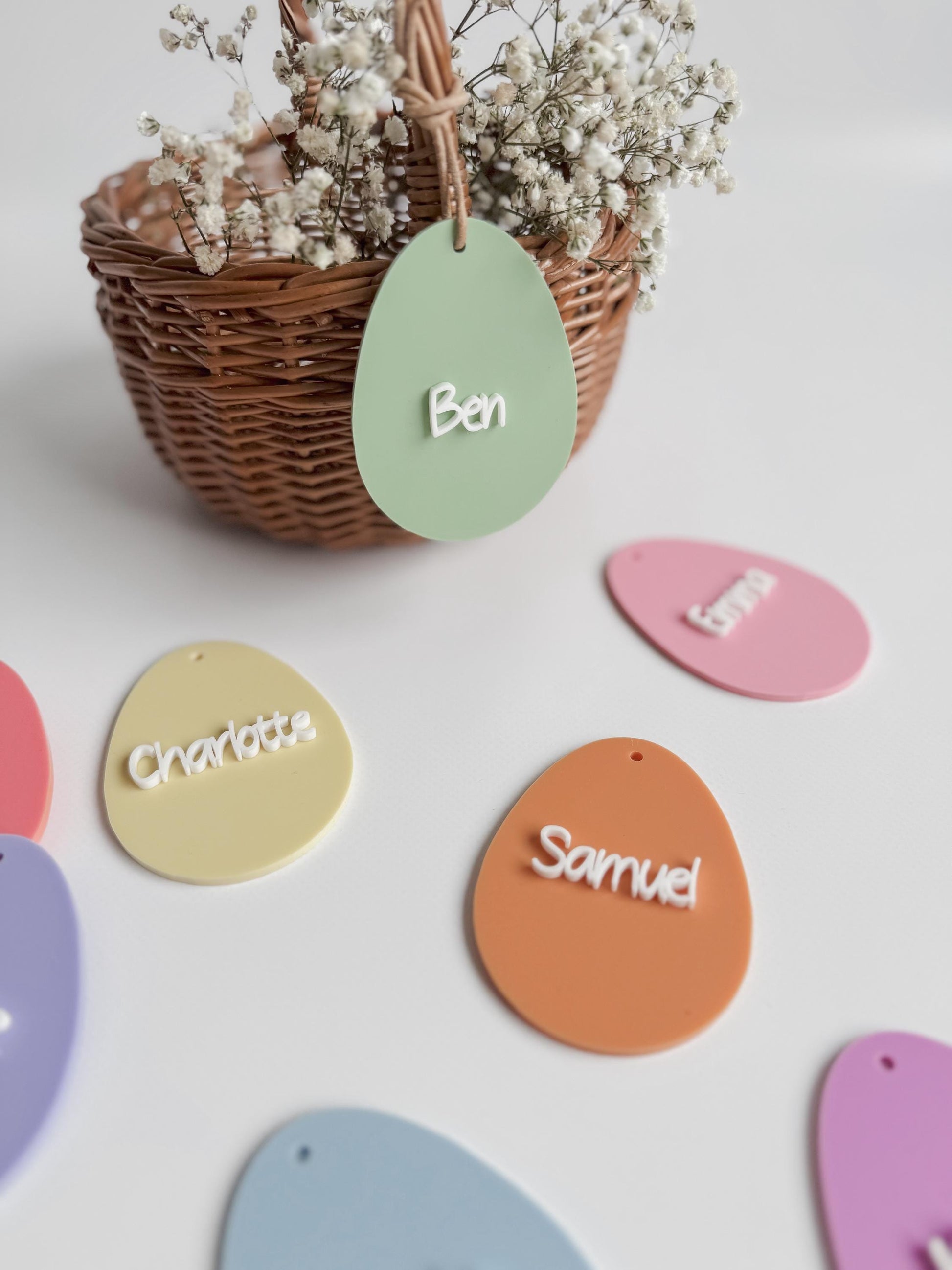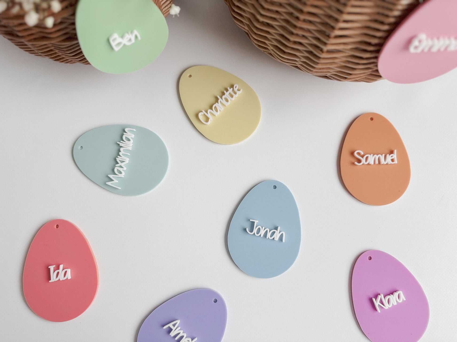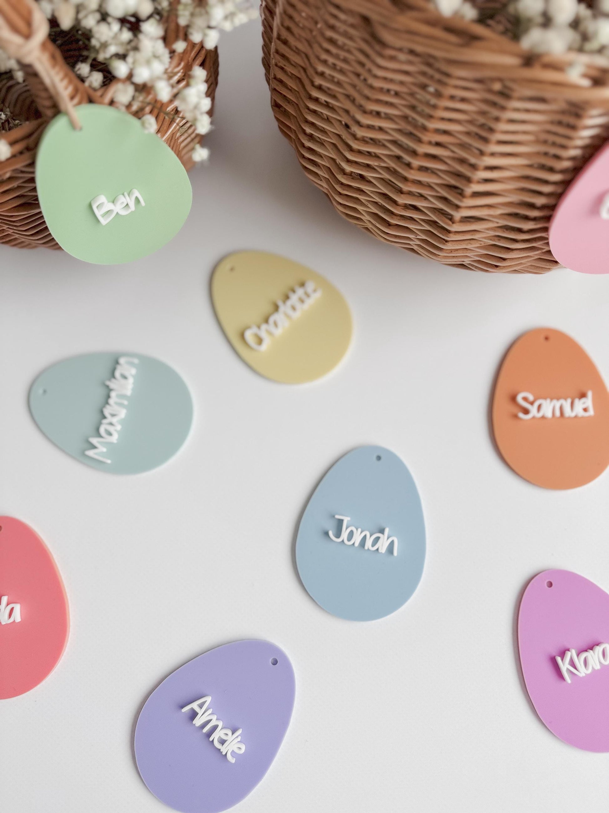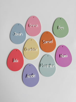 Unser personalisierter Anhänger in Ei-Form besteht aus zwei Lagen Acrylglas. Der Name wird immer aus weißem Acryl auf eine farbige Hintergrundplatte aufgeklebt. Der farbige Hintergrund ist frei wählbar.