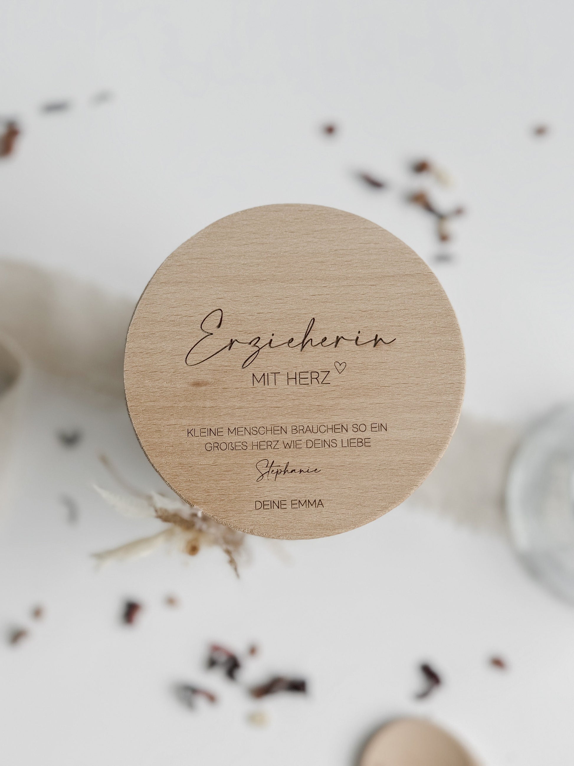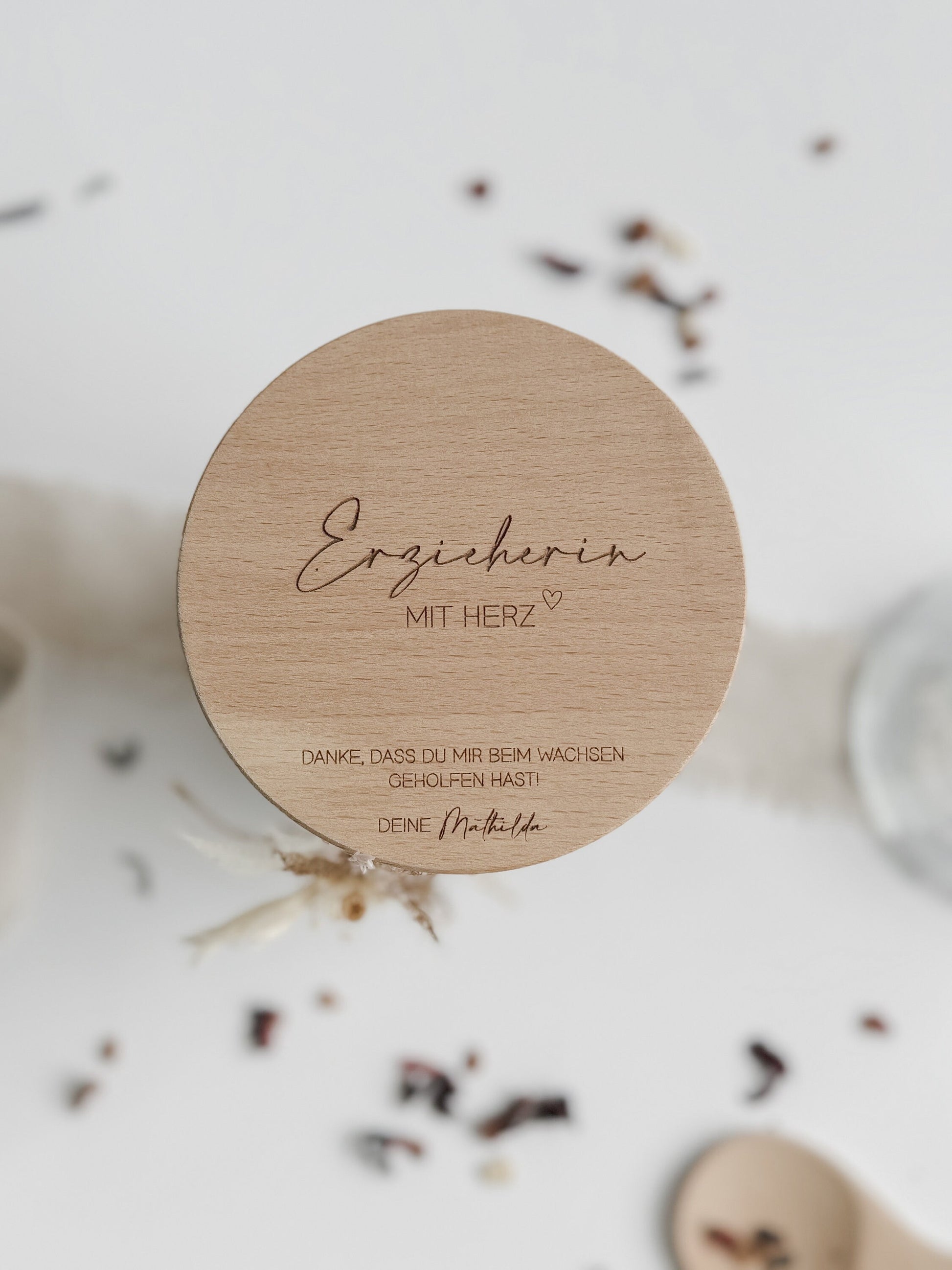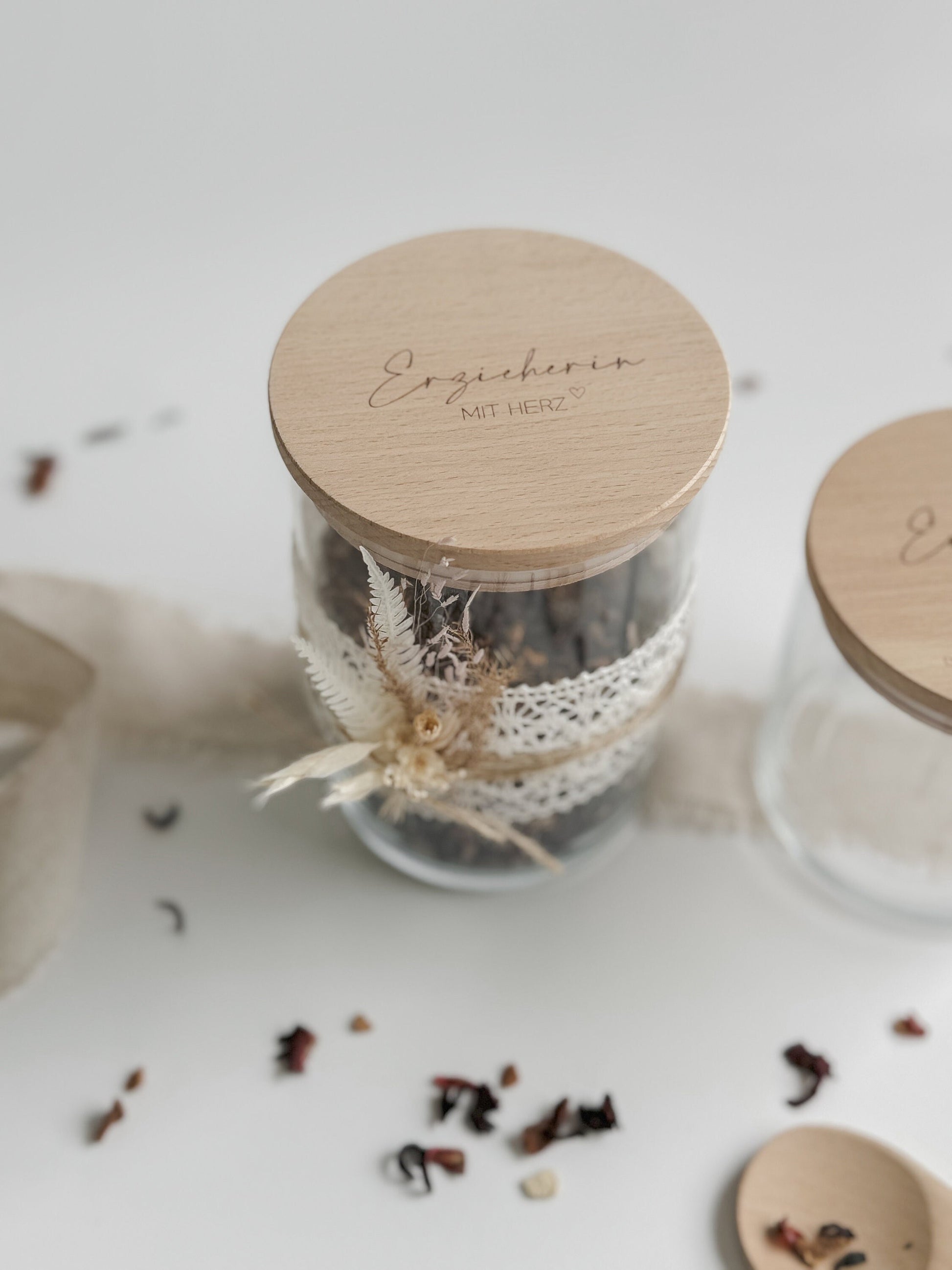 Im Lieferumfang enthalten: ♦ 1 Vorratsglas in der ausgewählten Größe mit graviertem Holzdeckel ♦ wahlweise dekoriert mit Spitzenband und einem kleinen Trockenblumenstrauß