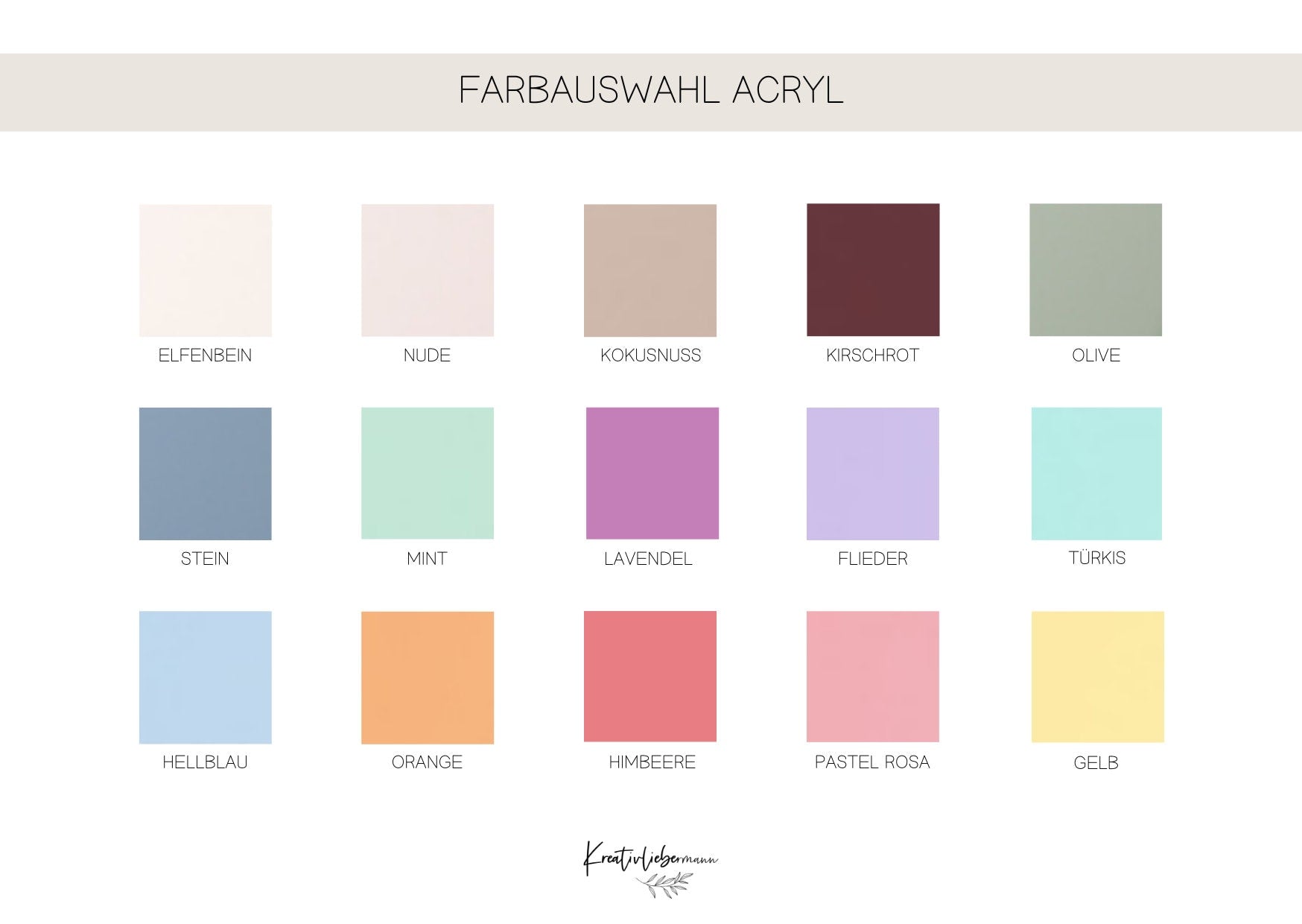 Produktdetails: ♦ Acrylglas 3mm, Gesamtdicke 6mm ♦ Maße: 3,5 – 5cm hoch, Länge variiert je nach Namenslänge