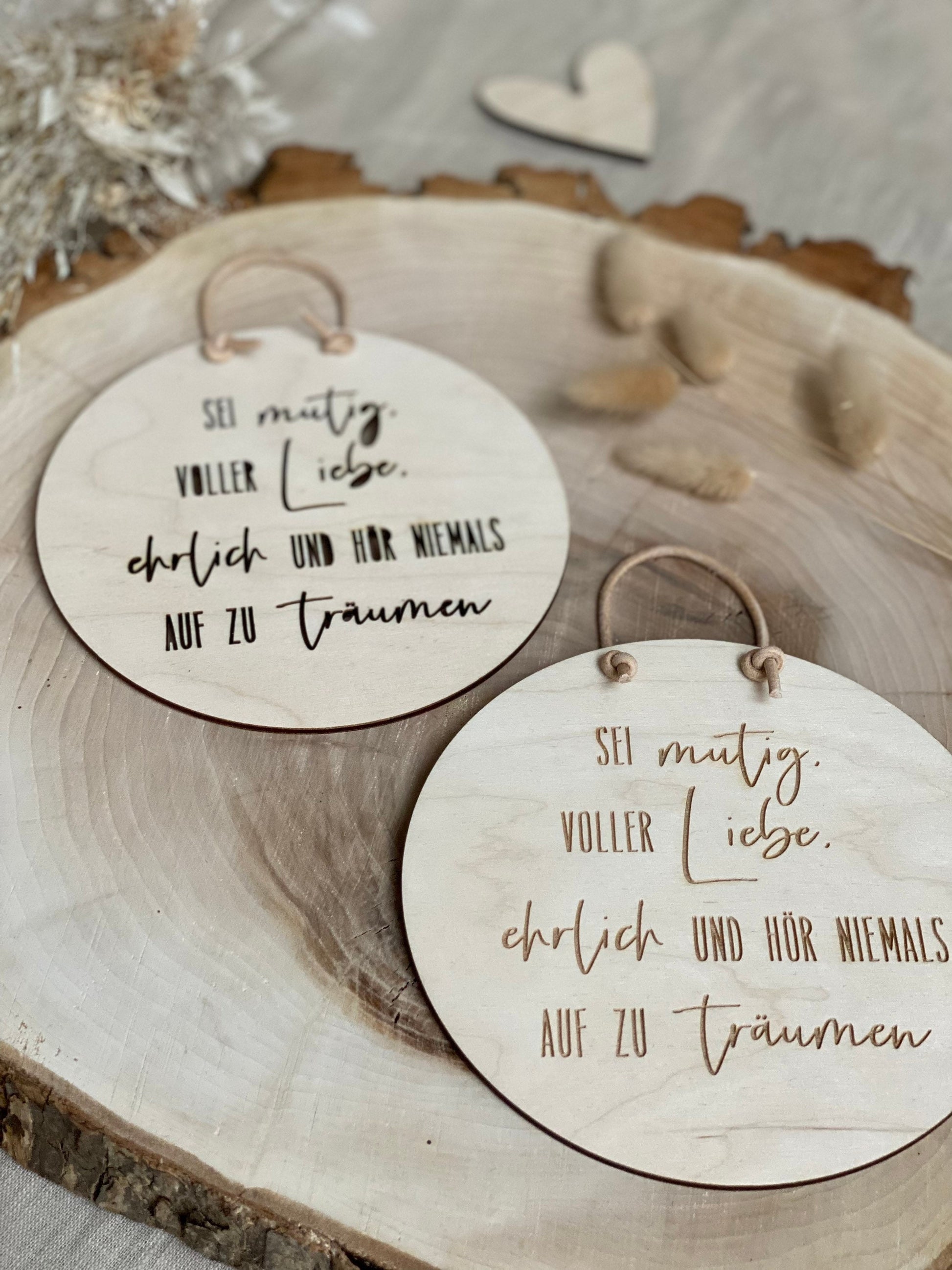 Die Schilder bestehen aus 3mm starkem Sperrholz, sind im Durchmesser 15 oder 20cm breit und haben eine Aufhänge-Schlaufe aus Lederband.