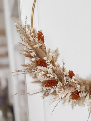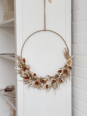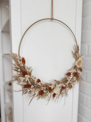Der Kranz besteht aus einem Metallring der mit hochwertigen Trockenblumen verziert wird.