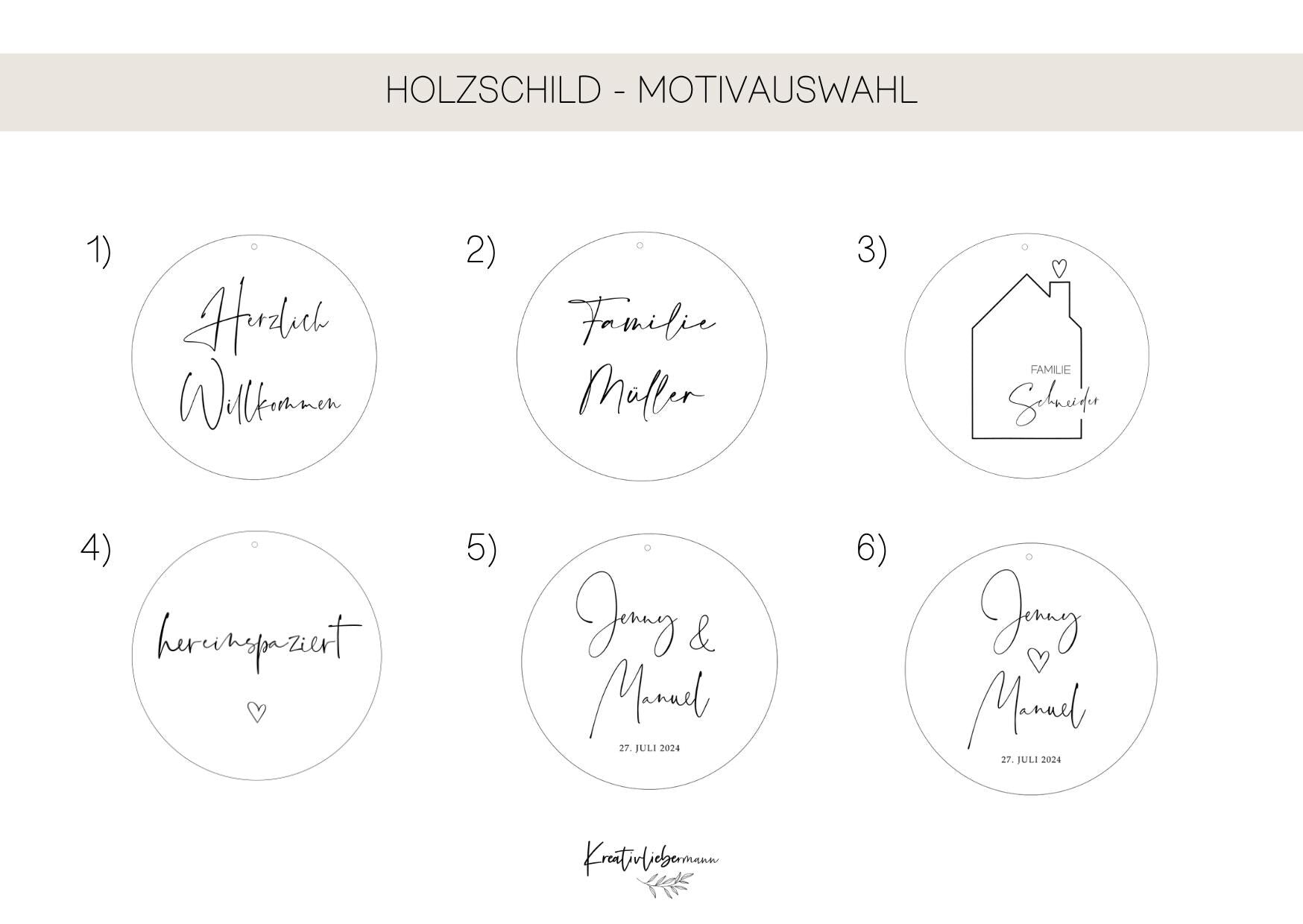 Produktdetails: ♦ Holzschild aus Birkensperrholz 3mm Stärke, einseitig lasergraviert; wahlweise in 15 oder 20cm ♦ Metallring Ø 30cm in der Farbe Gold (glänzend oder matt), Silber (glänzend), weiß oder schwarz