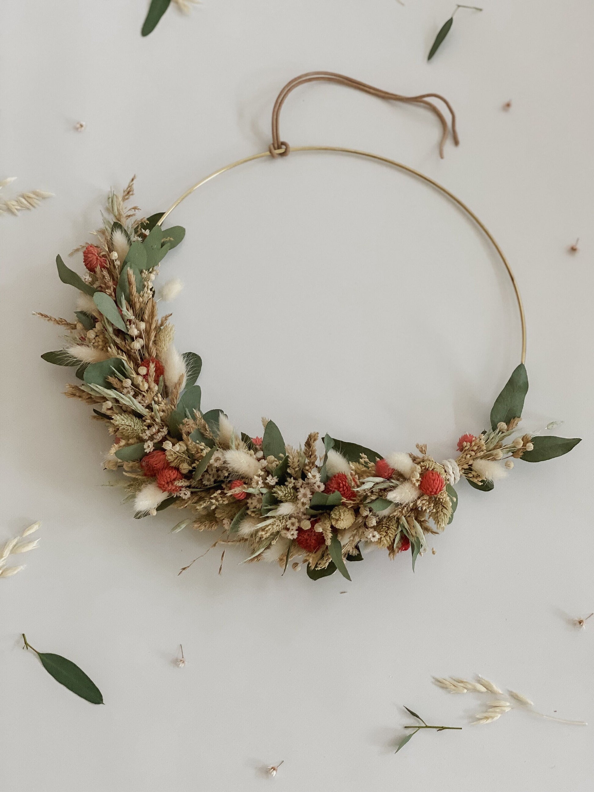 Der Kranz besteht aus einem Metallring der mit hochwertigen Trockenblumen verziert wird.