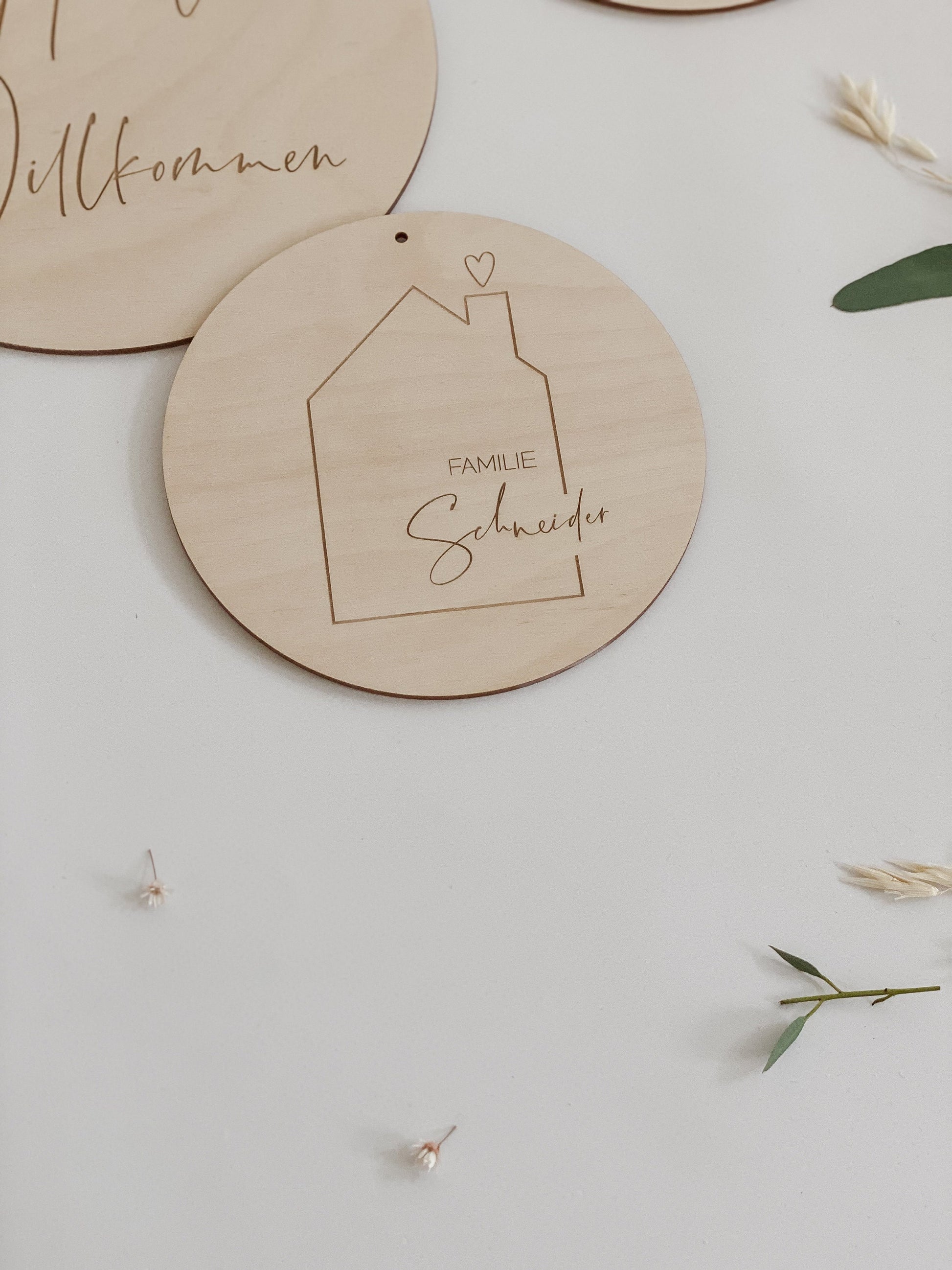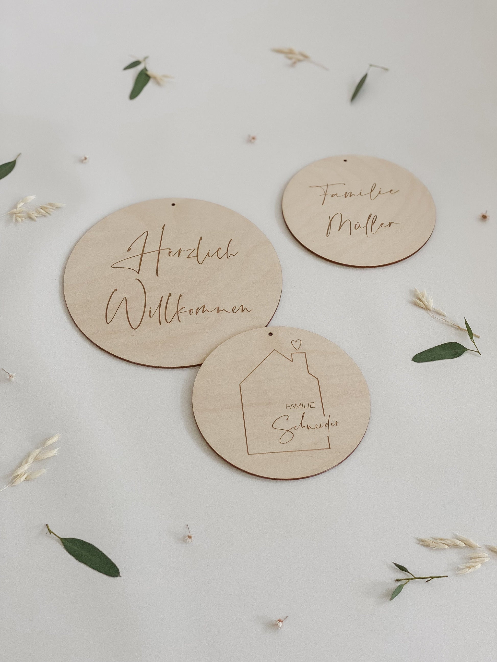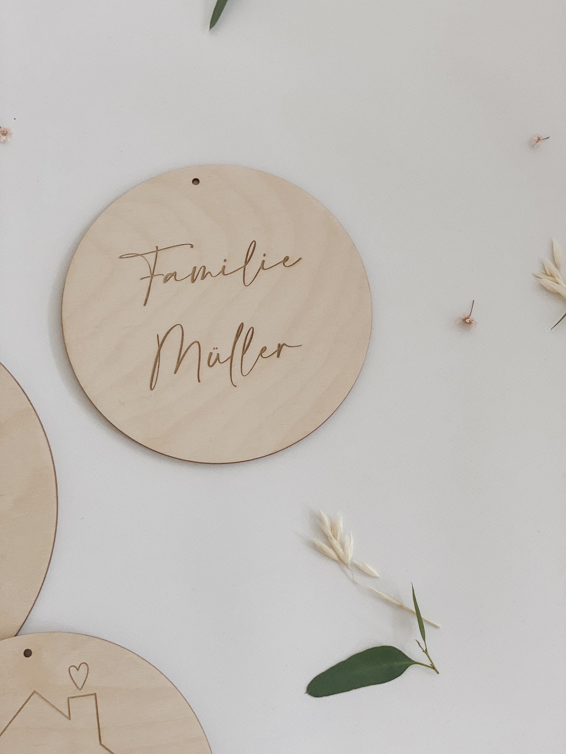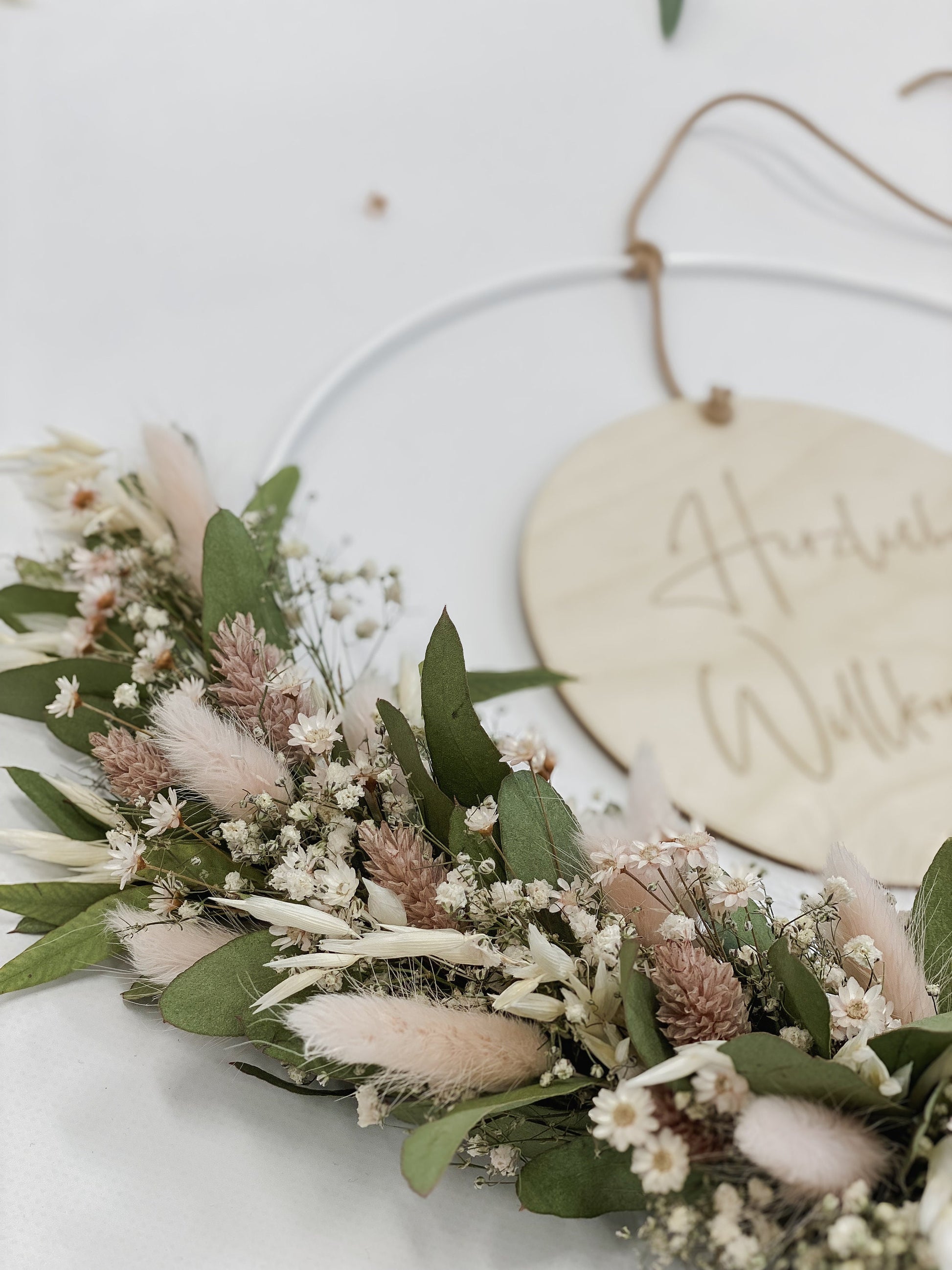 Optional könnt ihr ein Holzschild personalisieren lassen. Die Austauschscheibe kann zudem auch separat bestellt werden, somit könnt ihr den Trockenblumenkranz saisonbedingt anpassen.