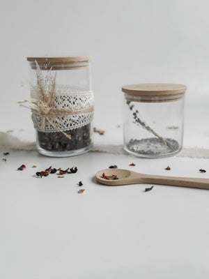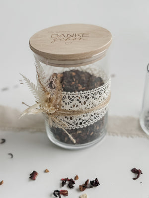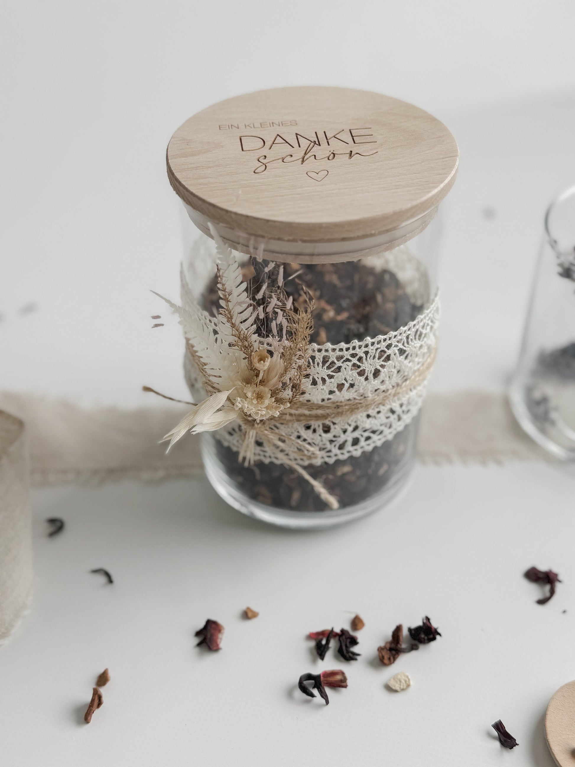 Im Lieferumfang enthalten: ♦ 1 Vorratsglas in der ausgewählten Größe mit graviertem Holzdeckel ♦ wahlweise dekoriert mit Spitzenband und einem kleinen Trockenblumenstrauß